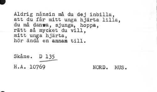//// Aldrig nånsin må du dej inbilla, //// att du får mitt unga hjärta lilla, ! //// du må danwa, sjunga, hoppa, //// rätt så mycket du vill, //// mitt unga hjärta, //// hör ändå en annan till. //// Skåne. D 135 //// H.A. 10769 NORD. MUS. ////
