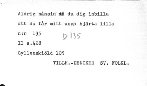 //// Aldrig nånsin då du dig inbilla //// att du får mitt unga hjärta lilla //// n:r 135 //// II s.423 //// Gyllenskiöld 105 //// TILLH.-DENCKER SV. FOLKL. ////