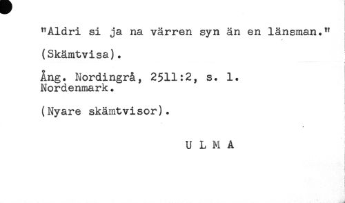 //// "Aldri si ja na värren syn än en länsman." //// * //// (Skämtvisa). //// < //// Ang. Nordingrå, 2511:2, s. 1. //// Nordenmark. //// - //// ! //// (Nyare skämtvisor). //// U L M A ////