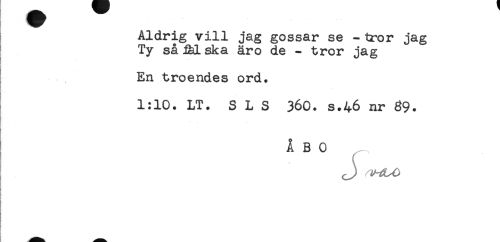 //// Aldrig vill jag gossar se - tror jag //// Ty så .&1 ska äro de - tror jag //// t //// En troendes ord. //// 1:10. LT. SLS 360. s.46 nr 39. //// ÅBO ////