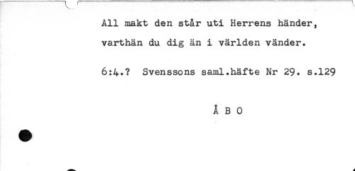 //// All makt den står uti Herrens händer, //// varthän du dig än i världen vänder. //// 6:4*? Svenssons saml.häfte Nr 29. s.129 //// ÅBO ////