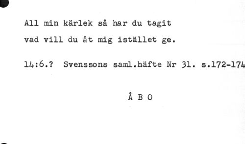 //// All min kärlek så har du tagit //// vad vill du åt mig istället ge. //// 14:6.? Svenssons saml.häfte Nr 31. s.172-174 //// ÅBO ////