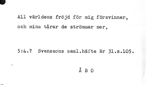 //// All världens fröjd för mig försvinner, //// och mina tårar de strömmar ner, //// 5:4.? Svenssons saml.häfte Nr 31.s.105. //// * ////