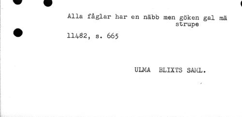 //// Alla fåglar har en näbb men göken gal mä //// strupe //// ^ 11462, s. 665 //// ULMA BLIXTS SAML. //// [ //// i ////