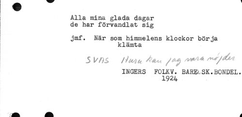 //// Alla mina glada dagar //// de har förvandlat sig //// jmf. När som himmelens klockor börja //// klämta //// 3 ^ ^^ //// INGERS FOLKV. BARE* SK.BONDEL. //// 1924 ////