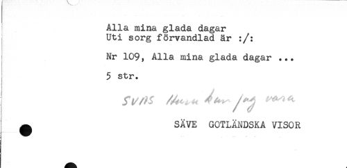 //// Alla mina glada dagar //// Uti sorg förvandlad är :/: //// Nr 109, Alla mina glada dagar ... //// 5 str. //// j //// i //// t //// ! //// jW^ ^ /F^ ^^ //// ^ SÄVE GOTLÄNDSKA VISOR ////