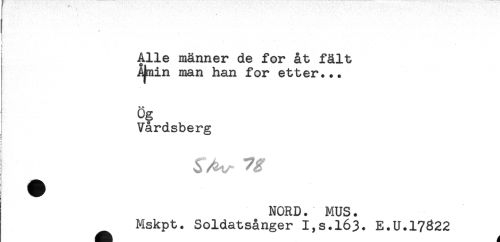 //// Alle männer de for åt fält //// Ajmin man han for etter... //// Og //// Vardsberg //// j //// 3 ^ ^ //// { y //// ! ^^ //// NORD. MUS. //// Mskpt. Soldatsånger I,s.l63. E.U.17^22 ////