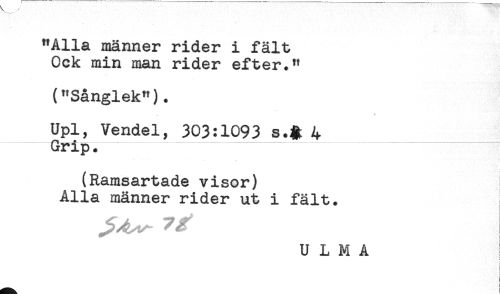 //// "Alla männer rider i fält //// Ock min man rider efter." //// ("Sånglek"). //// Upl, Vendel, 303:1093 s.# 4 //// Gripi //// (Ramsartade visor) //// Alla männer rider ut i fält. //// ULMA //// ] ////