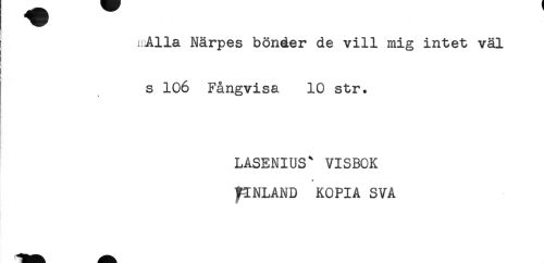 //// mAlla Närpes bönder de vill mig intet väl //// < //// ! //// s 106 Fångvisa 10 str. //// t //// LASENIUS^ VISBOK //// * //// ^INLAND KOPIA SVA ////