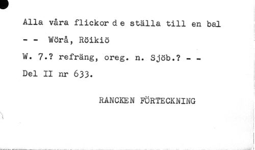 //// Alla våra flickor d e ställa till en bal //// i //// i //// < //// - - Wörå, Röikiö //// W. 7.? refräng, oreg. n. Sjöb.? - - //// Del II nr 633. //// t //// ! //// ! //// f //// RANCKEN FÖRTECKNING //// A //// t* //// ! //// i ////