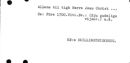 //// 1 Allena til tigh Herre Jesu Christ ... //// Se: Före 1700.Vitt.Sv.: (Sju gudeliga //// vijsor.) u.å. //// . //// KB:s SKILLINGTRYCKSREG. ////