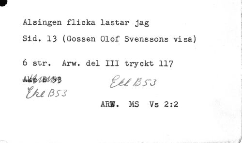 //// Alsingen flicka lastar jag I //// t //// Sid. 13 (Gossen Olof Svenssons visa) ' //// i //// < //// L //// i //// i //// i //// s //// 6 str. Arw. del III tryckt 117 //// : //// ARN. MS Vs 2:2 ////