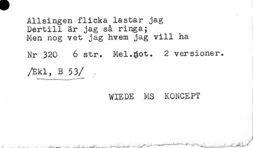 //// Allsingen flicka lastar jag //// Dertill är jag så ringa; //// Men nog vet jag hvem jag vill ha //// Nr 320 6 str. Mel.§ot. 2 versioner. //// < //// /Ekl, B 53 //// /-....... ... //// WIEDE MS KONCEPT //// ) //// } //// i //// f //// < //// t //// i //// ... ..,_____J ////