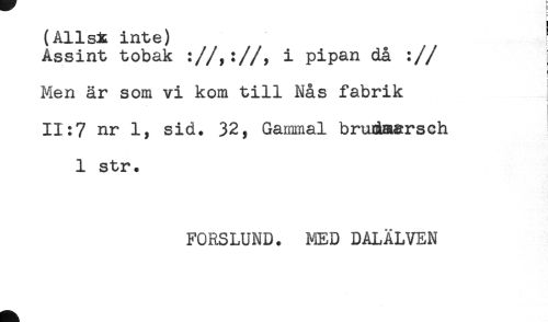 //// (Allst inte) ! //// Assint tobak ://,://, i pipan då : //// //! //// t //// Men är som vi kom till Nås fabrik //// 11:7 nr 1, sid. 32, Gammal brudmarsch //// 1 str. //// FORSLUND. MED DALÄLVEN ////