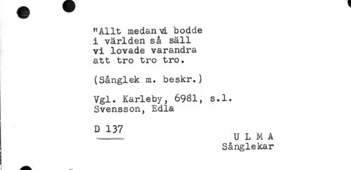 //// "Allt medan bodde //// i världen så säll //// vi lovade varandra //// att tro tro tro. //// (Sånglek m. beskr.) //// Vgl. Karleby, 6931, s.l. //// Svensson, Edla //// D 137 //// --ULMA //// Sånglekar ////