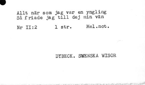 //// Allt när som jag var en yngling //// Så friade jag till dej min vän //// Nr 11:2 1 str. Mel.not. //// . 4" //// DYBECK. SWENSKA WISOR ////