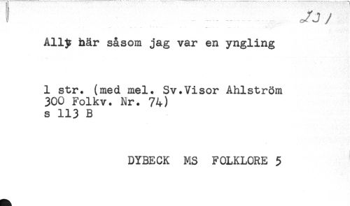 //// Allp här såsom jag var en yngling //// 1 str. (med mel. Sv.Visor Ahlström //// 300 Folkv. Nr. 74) //// s 113 B //// DYBECK MS FOLKLORE 5 ////
