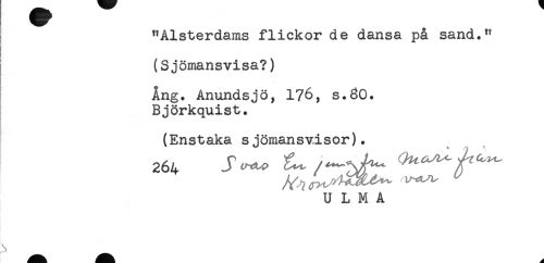 //// "Alsterdams flickor de dansa på sand." //// (Sjömansvisa?) //// . //// Ång. Anundsjö, 176, s.60. //// Björkquist. //// (Enstaka sjömansvisor). //// 264 -T"^ //// U L M A ////