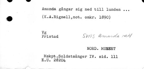 //// Amanda gångar sig ned till lunden ... //// ^ (K.A.Rignell,not. omkr. 1390) //// * //// Vg //// Fristad //// NORD. MUSEET //// Mskpt.Soldatsånger IV. sid. 111 //// E.U. 23204 ////