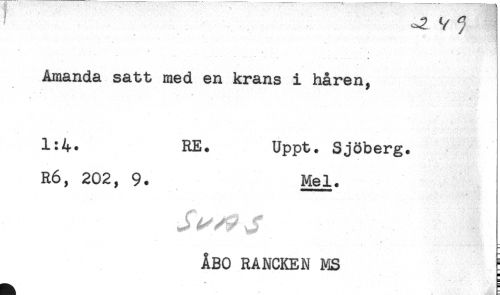 //// ... -. .... ^ ^ //// Amanda satt med en krans i håren. //// * //// * //// 1:4. RE. Uppt. Sjöberg. //// R6, 202, 9. Mel. //// ÅBO RANCKEN MS //// H ////