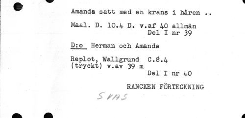 //// AHiaaua sa^t mea en Krans i håren .. //// Maal. D. 10.4 D. v.af 40 allmän //// Del I nr 39 //// D:o Herman och Amanda //// Replot, Wallgrund C.4 //// (tryckt) v.av 39 m //// Del I nr 40 //// RANCKEN FÖRTECKNING ////
