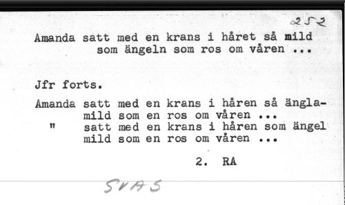 //// ^Z J ^ //// Amanda satt med en krans i håret så mild //// som ängeln som ros om våren *.. //// Jfr forts. //// Amanda satt med en krans i håren så ängla- //// mild som en ros om våren ... //// " satt med en krans i håren som ängel //// mild som en ros om våren ... //// * ^ //// 2. RA ////