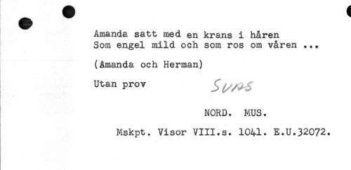 //// ^ Amanda satt med en krans i håren //// Som engel mild och som ros om våren ... //// - //// (Amanda och Herman) //// Utan prov ^^^ //// NORD. MUS. //// Mskpt. Visor VIII.s. 1041. E.U.32072. ////