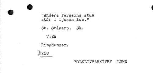 //// "Anders Perssons stua //// står i ljusan lua." //// St. Stågarp. Sk. //// 7:24 //// Ringdanser. //// 2 208 //// FOLKLIVSARKIVET LUND ////