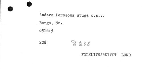 //// j Anders Perssons stuga o.s.v. //// ! //// < //// Berga, Sm. //// 6516:5 //// . //// FOLKLIVSARKIVET LUND ////