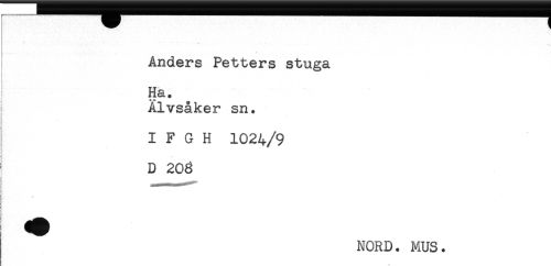 //// Anders Petters stuga //// i . //// i //// Ha. //// I Älvsåker sn. //// f //// I F G H 1024/9 //// D 208 //// < //// NORD. MUS. ////