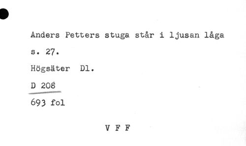 //// Anders Petters stuga står i ljusan låga //// s. 27. //// Högsäter Dl. //// D 208 //// 693 fol //// V F F ////
