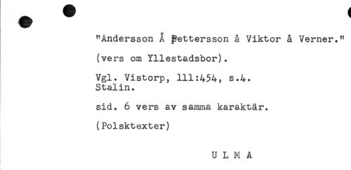 //// "Andersson Å Pettersson å Viktor å Verner." //// (vers om Yllestadsbor). //// Vgl. Vistorp, 111:454, s.4. //// Stalin. //// sid. 6 vers av samma karaktär. //// * //// (Polsktexter) //// U L M A //// t ////