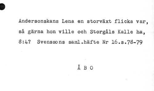 //// Andersonskans Lena en storväxt flicka var, //// så gärna hon ville och Storgåls Kalle ha, //// 6:4? Svenssons saml.häfte Nr 16.s.73-79 //// * //// ÅBO ////