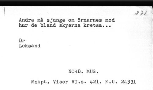 //// Andra må sjunga om örnarnes mod //// hur de bland skyarna kretsa..* //// * //// Dr //// Leksand //// t //// NORD. MUS. //// Mskpt. Visor VI.s. 421. E.U. 24331 ////
