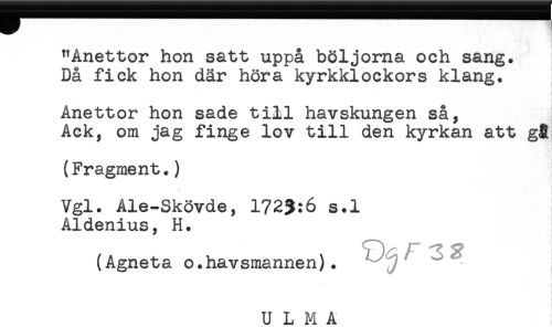 //// "Anettor hon satt uppå böljorna och sang. //// Då fick hon där höra kyrkklockors klang. //// Anettor hon sade till havskungen så, //// Ack, om jag finge lov till den kyrkan att g5 //// (Fragment.) //// <i //// ** //// Vgl. Ale-Skövde, 1723:6 s.l //// Aldenius, H. //// (Agneta o. havsmannen). ^ /' ^ ^ ^ ; //// U L M A ////