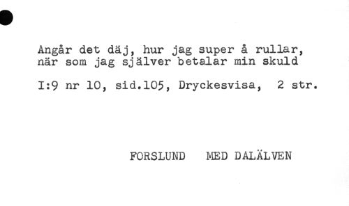 //// Angår det dåj, hur jag super å rullar, //// när som jag själver betalar min skuld //// 1:9 nr 10, sid.105, Dryckesvisa, 2 str. //// FORSLUND MED DALÄLVEN ////
