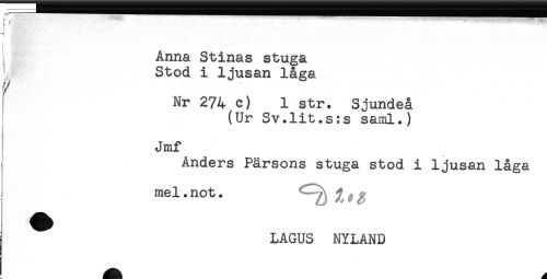 //// ? //// Anna Stinas stuga //// Stod i ljusan låga //// Nr 274 c) 1 str. Sjundeå //// (Ur Sv.lit.s:s saml.) //// t //// j //// Jmf //// Anders Pärsons stuga stod i ljusan låga //// mel.not. //// ^ LAGUS NYLAND ////