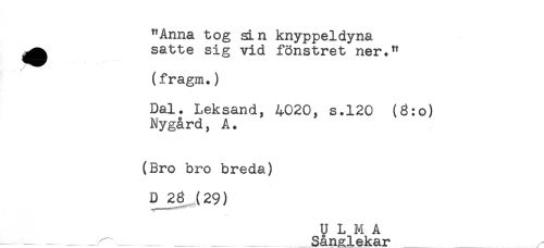 //// "Anna tog si n knyppeldyna //// ^^ satte sig vid fönstret ner." //// (fragm.) //// Dal. Leksand, 4020, s.120 (3:o) //// Nygård, A. //// (Bro bro breda) //// D 23 (29) //// U L M A //// - - - - -r _____ _ _ ^Sånglekar _____r ////