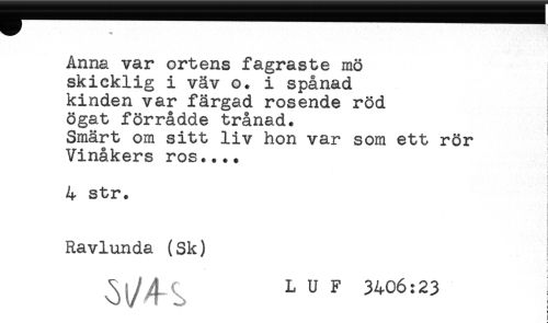 //// Anna var ortens fagraste mö //// skicklig i väv o. i spånad //// kinden var färgad rosende röd //// ögat förrådde trånad. //// Smärt om sitt liv hon var som ett rör //// Vinåkers ros.... //// c //// 4 str. //// t //// Ravlunda (Sk) ! ////