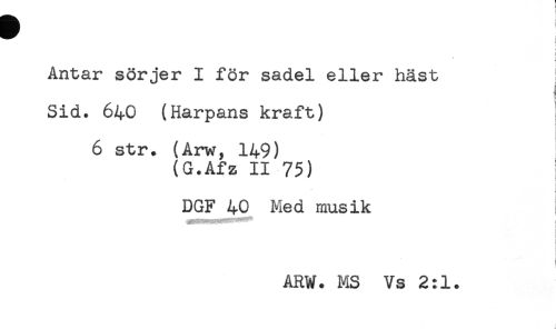 //// t //// f //// Antar sörjer I för sadel eller häst //// i //// Sid. 640 (Harpans kraft) //// . //// 6 str. (Arw, 149) //// (G.Afz II 75) //// t //// DGF 40 Med musik //// i //// ( //// ARW. MS Vs 2:1. ////