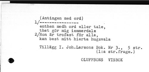 //// Antingen med ord) //// enthen medh ord eller tale, //// thet gör mig iemmerdale //// 2/Hon är trofast för alla, //// kan best mitt hierta hugsvala //// Tillägg 1. Joh.Larsons Bok. Nr 3., 5 str. //// (1:a str.fragm.) //// ^ OLUFFSONS VISBOK ////