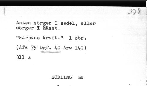 //// ^ ! //// ! //// = //// Anten sorger I sadel, eller //// sorger I Mässt. //// "Harpans kraft." 1 str. //// (Afz 75 Dgf. 40 Arw 149) //// 311 s //// < //// c //// ! //// SÖDLING ms //// H) //// * = ////