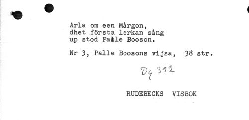 //// Arla om een Mårgon, //// dhet första lerkan sång //// ! up stod PaMe Booson. //// Nr Palle Boosons vijsa, 38 str. //// RUDEBECKS VISBOK //// t ////