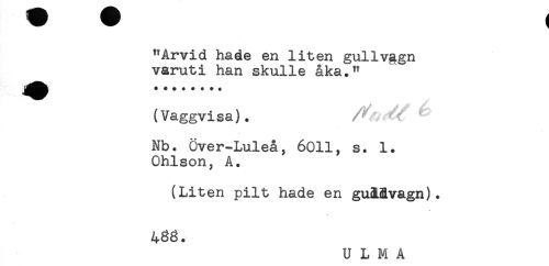//// "Arvid hade en liten gullv§gn //// varuti han skulle åka." //// ... //// (Vaggvisa). ' //// Nb. Över-Luleå, 6011, s. 1. //// Ohlson, A. //// (Liten pilt hade en guAAvagn). //// U L M A ////
