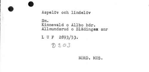 //// ^ Aspelöv och lindelöv //// Sm. //// Kinnevald o Allbo hdr. //// Allmundsrud o Blädinges snr //// L U F 2393/53. //// NORD. MUS. ////