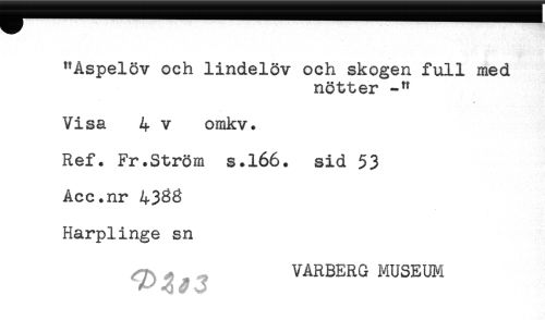 //// "Aspelöv och lindelöv och skogen full med //// nötter -" //// Visa 4 v omkv. //// Ref. Fr.Ström s.l66. sid $3 //// Acc.nr 4333 //// Harplinge sn //// J VARBERG MUSEUM ////