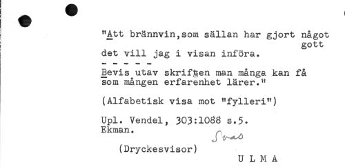 //// "Att brännvin,som sällan har gjort något //// ! gott //// det vill jag i visan införa. //// Bevis utav skriften man många kan få //// som mången erfarenhet lärer." //// t //// (Alfabetisk visa mot "fylleri") //// Upl. Vendel, 303:1088 s.5. //// Ekman. //// J //// (Dryckesvisor) //// U L M A ////