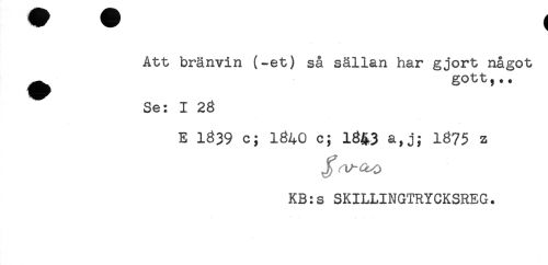 //// Att bränvin (-et) så sällan har gjort något //// ^^ gott,.. //// Se: I 28 //// E 1839 c; 1840 c; 18&3 a,j; 1875 z //// KB:s SKILLINGTRYCKSREG. ////