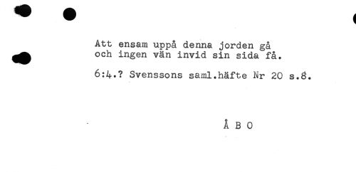 //// Att ensam uppå denna jorden gå //// ^^ och ingen vän invid sin sida få. //// 6:4.? Svenssons saml.häfte Nr 20 s.8. //// ÅBO ////