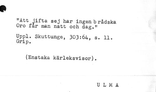 //// "Att Jifta sej har ingen b rådska //// Oro far man natt och dag." //// Uppl. Skuttunge, 303:64, s. 11. //// Grip. //// (Enstaka kärleksvisor). //// U L M A ////